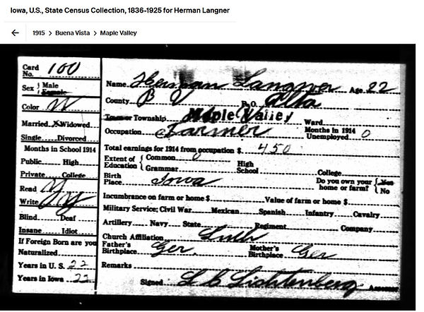 Henry Langner was born in November 30, 1895 in Storm Lake, IA. Census records indicate that he remained in the Iowa area for his youth and was conscripted on June 5, 1917. He then entered the service on July 29, 1918 and 6 months later he was released (February 19, 1919).