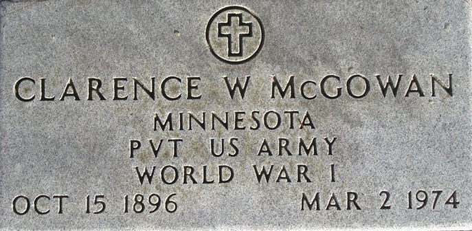 Clarence was born October 15, 1896 to parents William and Esther (Duxbury) McGowan in Eden Township, Pipestone, Minnesota. He had two older brothers, Edwin Raymond (February 3, 1883) and Leslie Ezra (July 20, 1892). By 1910, his family had moved to South Dakota and lived near White in Brookings County. William had noted on the Census for that year that his occupation was 'notable cripple' though no indication was given as to the reason for this status change (previously he had been a day laborer). Clarence had completed his fifth year in school and would not go any further, instead staying home and helping his family.