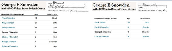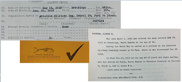 George was born to Frank and Mary Snowden while they lived in Missouri. From the 1900 Census, George has one older brother and two younger brothers and a sister. By 1910, George is 18 years old and living as a boarder with his father and younger brother Charles at the Frank Mass home. George married Alma Reuter on October 22, 1919 (he put his age as 33, but it should have been 27). George worked as a carpenter foreman while working in Brookings, SD for A.M. Wold (per WWI registration on June 5, 1917). Per the Master Index of Veterans, George had the rank of Private Unsg, and research provided by B. Kleinjan lists his service in the Aviation Military Ing. School in St. Paul, MN. George died on December 19, 1919 and is interred at Fairview Cemetery, White, SD. His widow, Alma, married George's older brother Harry two years after George's death.