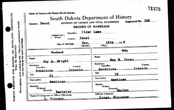 Guy was born to George and Mary Wright on December 11, 1888 as the second of six children. He joined the 333rd Field Artillery unit of the US Army on June 24, 1918 and was discharged on January 19, 1919. Upon returning to the family, he lived with his parents until his marriage to May Jones on November 18, 1919. They had four children. Per the 1940 Census, Guy was again living with his Mother. He passed away on November 12, 1973